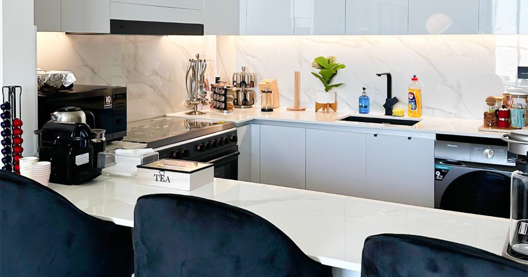 - Fully equipped kitchen with kitchenware and white goods.